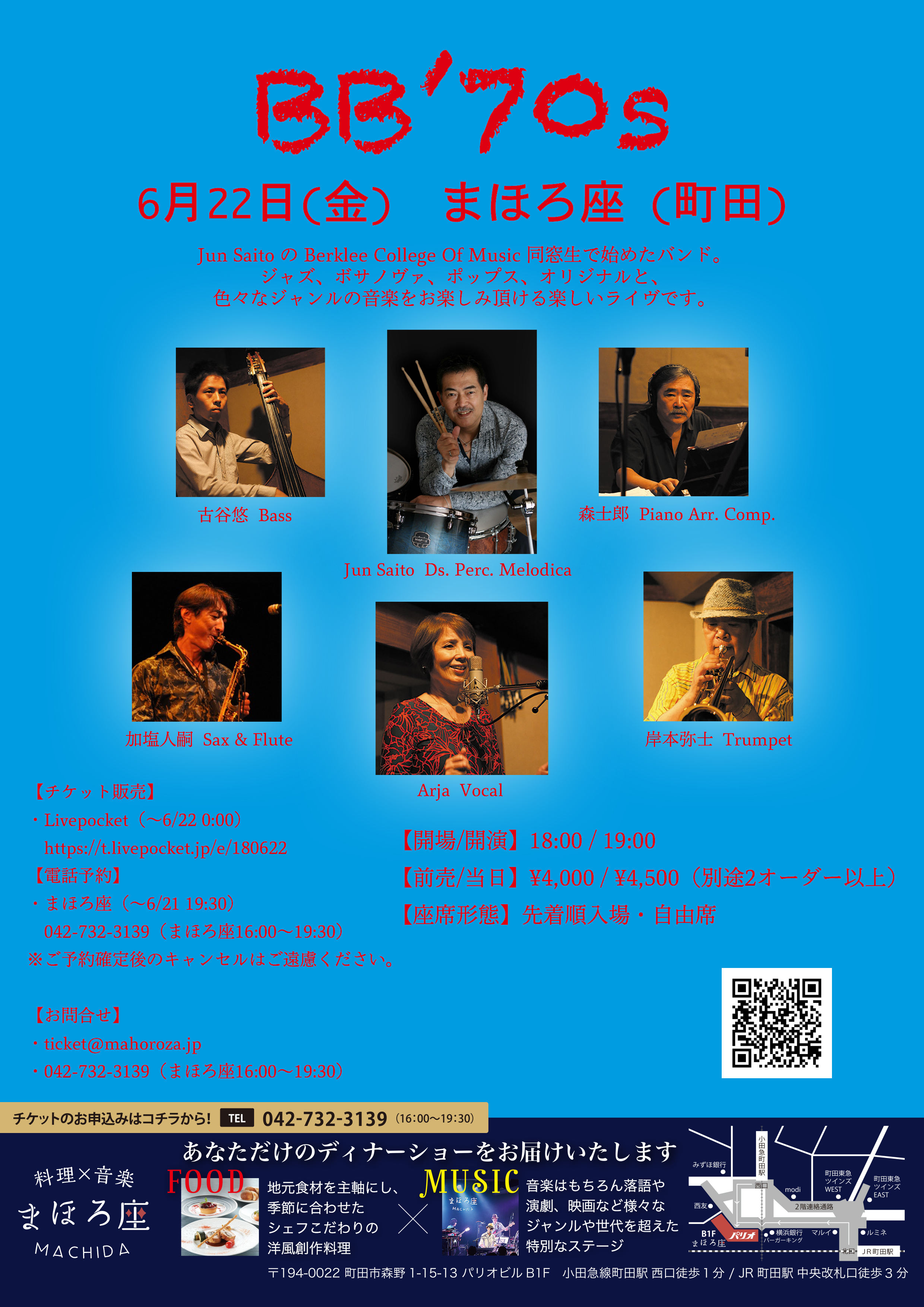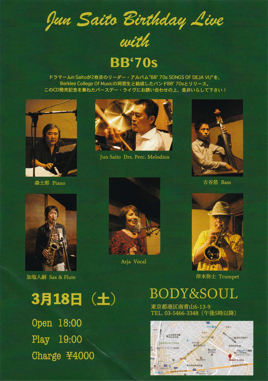 2017年3月18日(土)東京・青山の「BODY&SOUL」にてBB'70sのライブがあります。